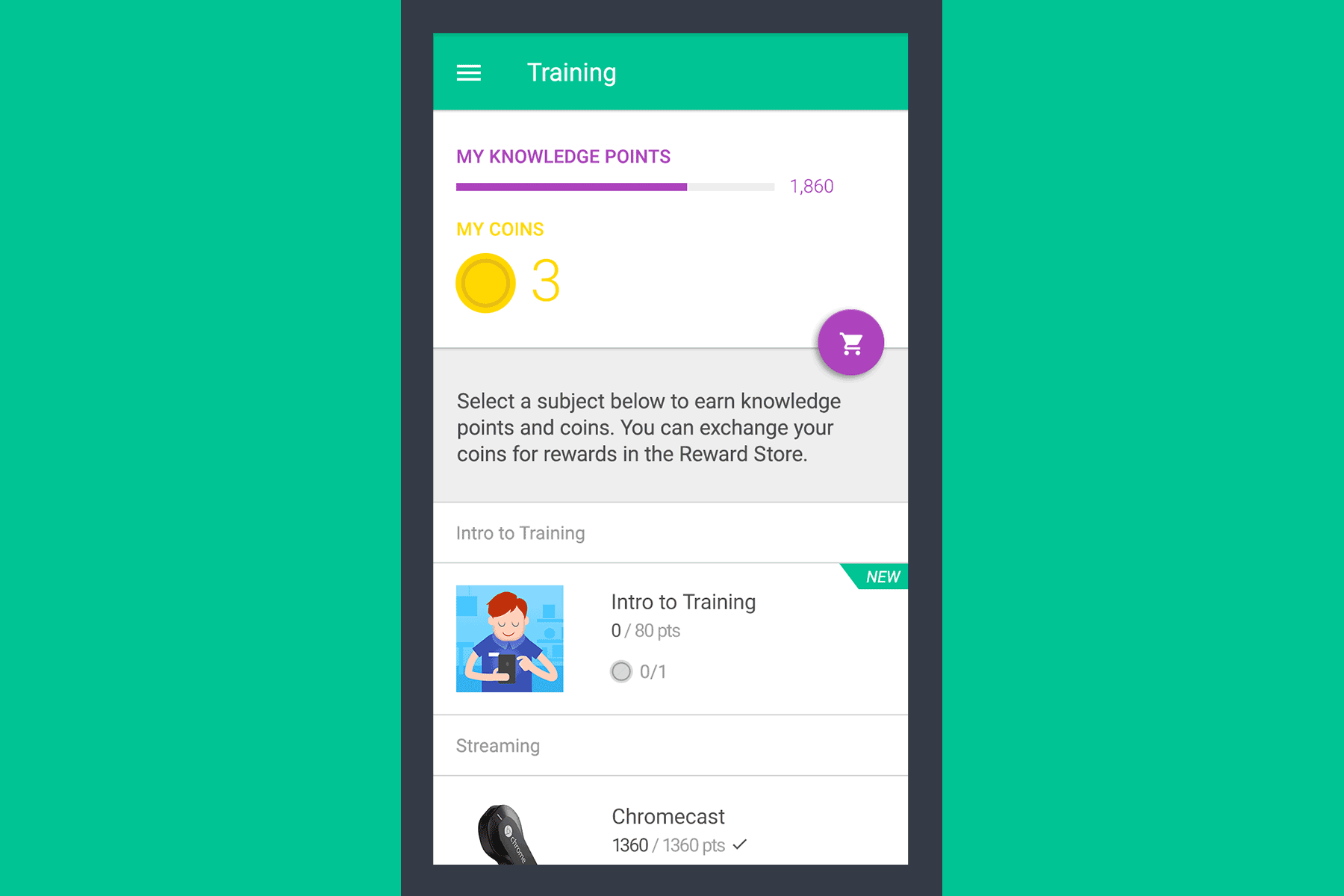 Series of courses about Google products and services. Each course is made up of 3 learning levels: basic, intermediate and advanced. The retail associate completes 3 quizzes and a test at the end of a course to earn points that can be cashed in for rewards.